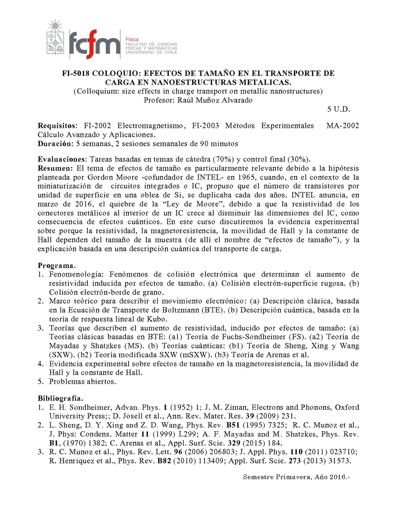FI5018-1 Coloquio: Efectos de Tamaño en el Transporte de Carga en Nanoestructuras Metálicas 2016, Primavera