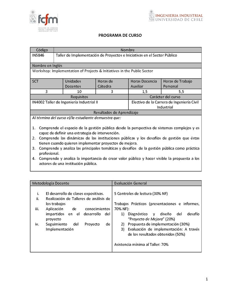 IN5846-1 Taller de Implementación de Proyectos e Iniciativas en el Sector Público 2016, Primavera