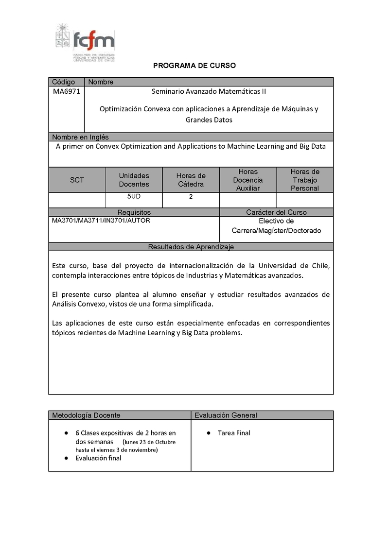 MA6971-1 Seminario Avanzado Matemáticas II Optimización Convexa con aplicaciones a Aprendizaje de Máquinas y Grandes Datos 2017, Primavera