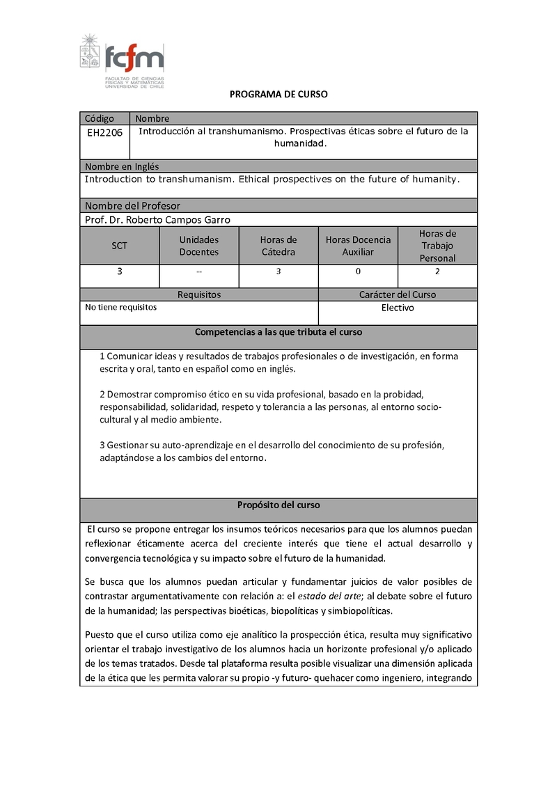 EH2206-1 Introducción al Transhumanismo. Prospectivas Éticas Sobre el Futuro de la Humanidad 2018, Primavera