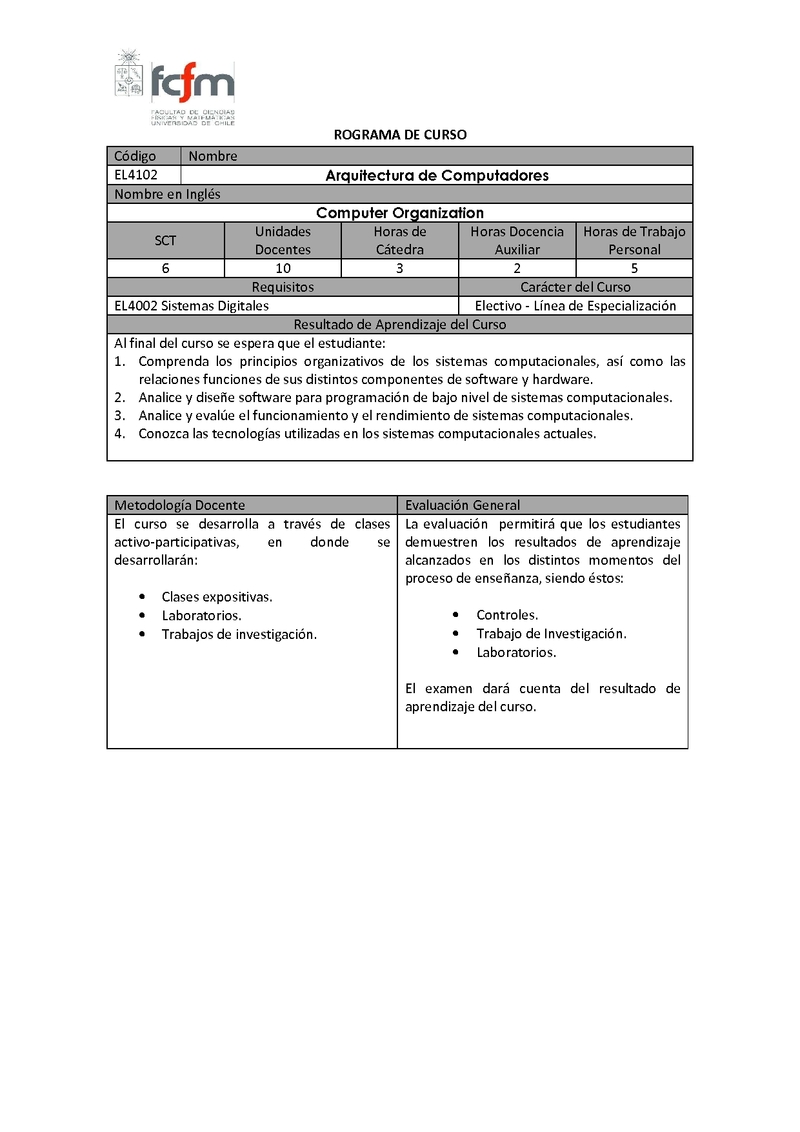 Descripción Los Procesadores son sistemas digitales que se han desarrollado de una forma vertiginosa desde los años 80 y que han tomado su camino propio. Esto ha significado que, del punto de vista académico, este tema sea tratado en forma separada y no como parte de un curso de Sistemas Digitales. En este curso se analizan las diferentes arquitecturas de diseño de un Procesador que se han desarrollado en el tiempo y a lo que se ha llegado en la actualidad. Además, permite a los alumnos comprender la terminología y conceptos que se utilizan en la descripción y especificaciones de estos dispositivos.