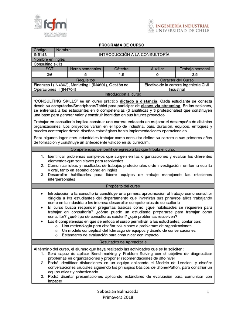 | Descripción | “CONSULTING SKILLS” es un curso práctico dictado a distancia. Cada estudiante se conecta desde su computador/Smartphone/Tablet para participar de clases vía streaming. En las sesiones, se entrenará a los estudiantes en 6 competencias (3 analíticas y 3 profesionales) que constituyen una base para generar valor y construir identidad en sus futuros proyectos Trabajar en consultoría implica construir una carrera enfocada en mejorar el desempeño de distintas organizaciones. Los proyectos varían en el tipo de industria, país, duración, equipos, enfoques y pueden contemplar desde diseños estratégicos hasta implementaciones operacionales. Para algunos ingenieros industriales trabajar como consultor define su carrera o sus primeros años de formación y constituye un antecedente valioso en su curriculm. |