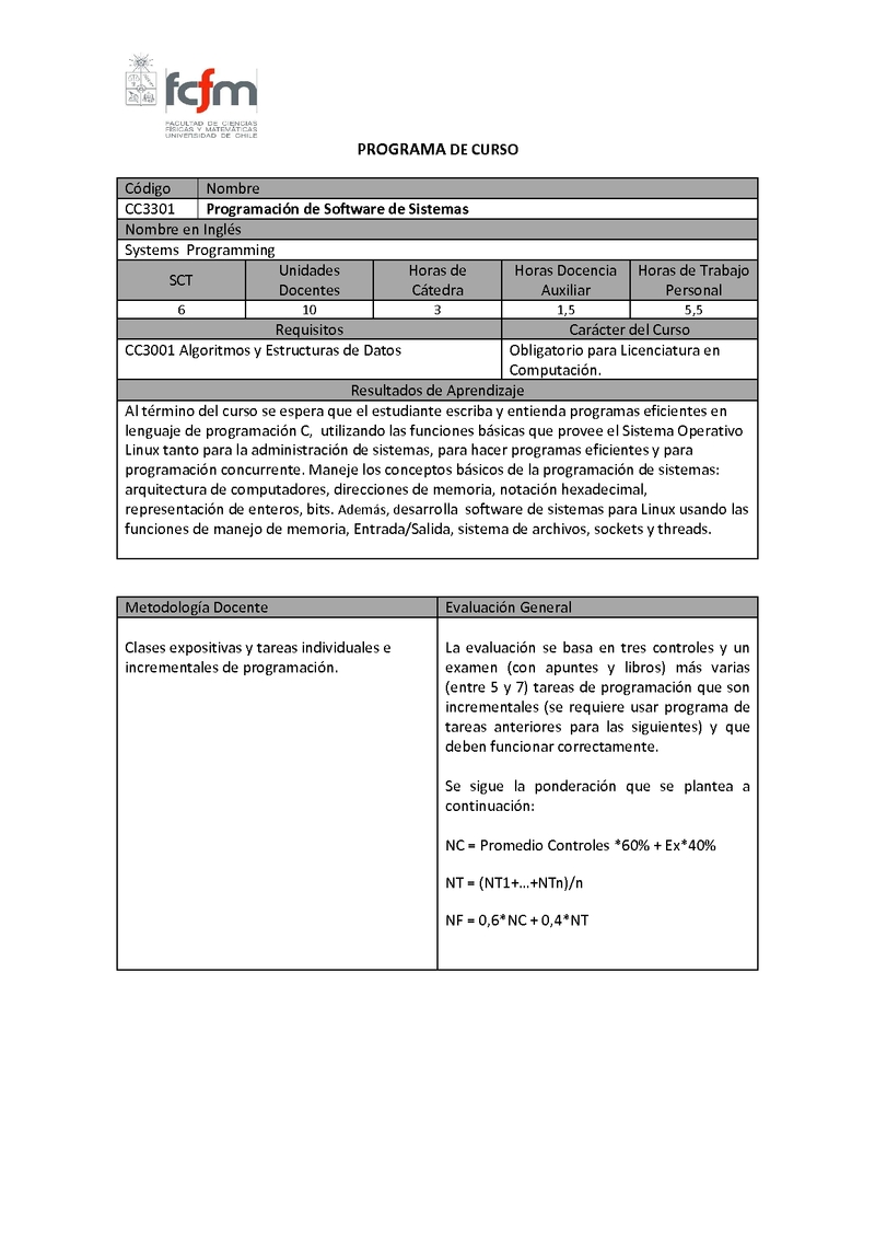 | Descripción | Nota de tareas: 60% de la nota final NT= promedio de 8 tareas Nota de controles: 40 % de la nota final NC = 0.4 * control + 0.6 * examen Por reglamento nadie se exime del examen (se requieren 2 controles) Para aprobar el curso se necesita que NC>=4 y NT>=4 Las tareas se entregan por medio de U-cursos, deben pasar los tests de prueba en la distribución Debian 10 de Linux, en 32 y 64 bits, y cumplir con las restricciones indicadas en el enunciado, de lo contrario la tarea será rechazada. Debian bajo WSL 1 no sirve porque no permite correr programas en 32 bits. Sí sirve Debian bajo WSL 2. No se elimina ninguna tarea y no habrá tarea recuperativa. Recursos: Apuntes del curso y controles de semestres anteriores. |