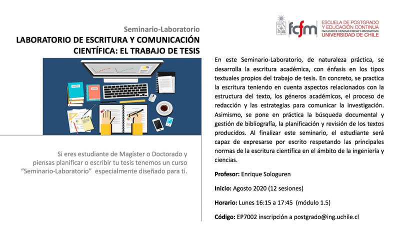| Descripción | En este seminario-laboratorio, de naturaleza práctica (grupos de escritura), se trabaja la redacción académica, con énfasis en los géneros científicos especializados en ingeniería y ciencias con foco en el trabajo de tesis. En concreto, se practica la escritura teniendo en cuenta aspectos relacionados con la estructura del texto, los géneros académicos, el proceso de redacción y la normativa avanzada. Asimismo, se pone en práctica la búsqueda documental y la gestión de bases de datos bibliográficas. Al finalizar el taller, el estudiante será capaz de expresarse por escrito respetando las principales normas de la escritura científica en el ámbito de la ingeniería y ciencias. | |