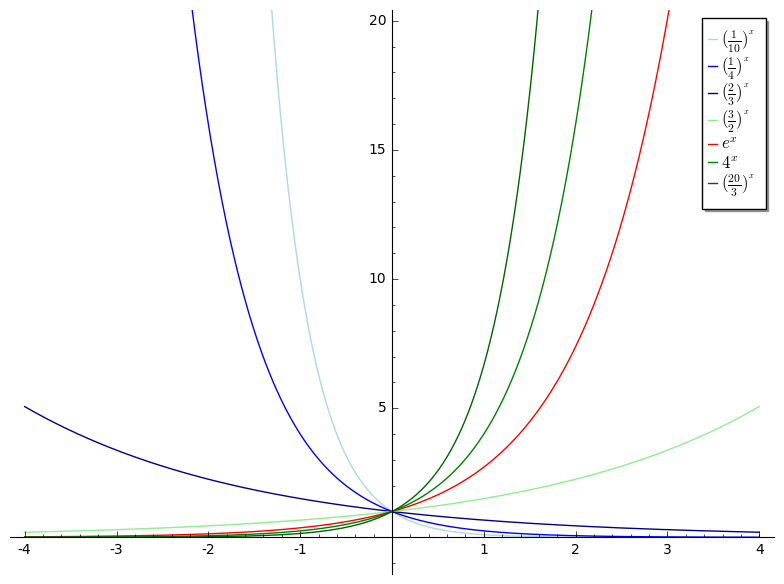 Descripción Gráficos de varias funciones exponenciales con bases distintas. Notense que (como vimos en cátedra) para bases estrictamente entre 0 y 1 las funciones decrecen, mientras para bases mayores que 1 las funciones crecen.