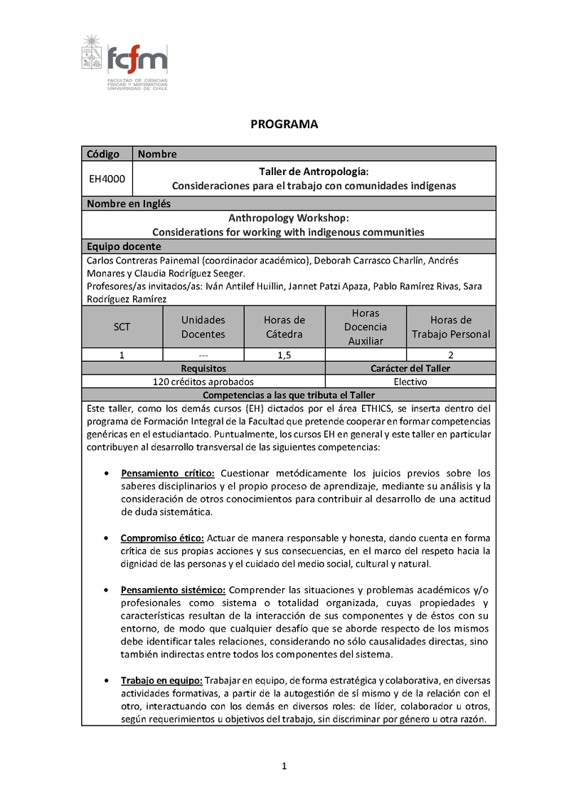 EH4000-1 Taller de Antropología: Consideraciones para el trabajo con comunidades indígenas 2022, Primavera