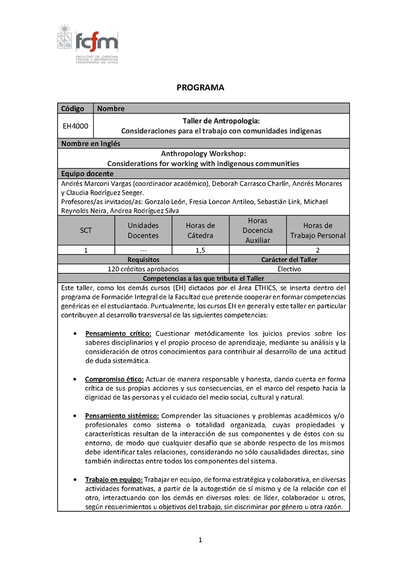 EH4000-1 Taller de Antropología: Consideraciones para el trabajo con comunidades indígenas 2023, Primavera