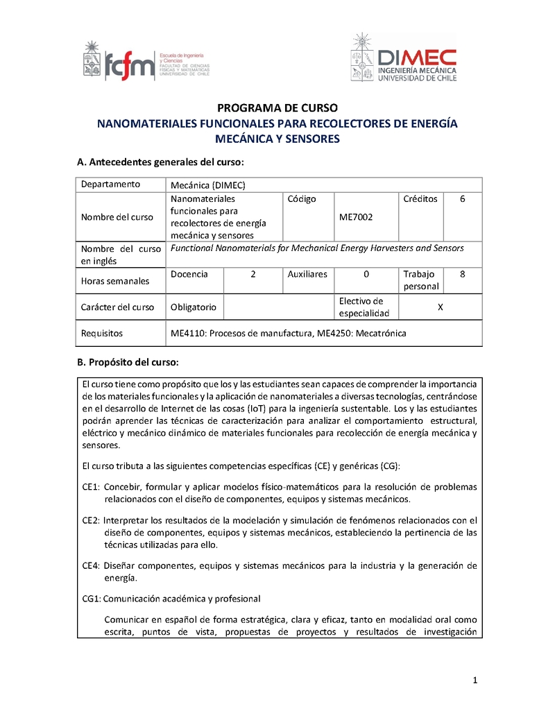 ME7002-1 Nanomateriales funcionales para recolectores de energía mecánica y sensores 2023, Primavera