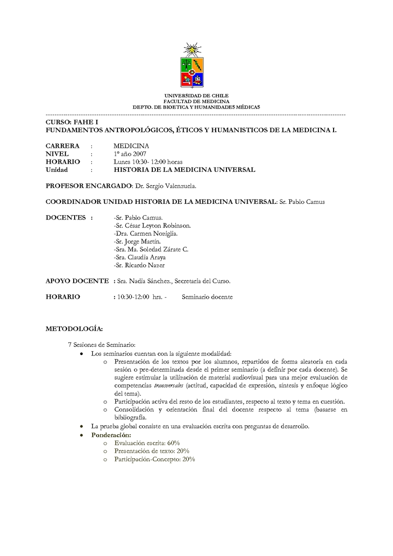 | Metodología | 7 Sesiones de Seminario: • Los seminarios cuentan con la siguiente modalidad: o Presentación de los textos por los alumnos, repartidos de forma aleatoria en cada sesión o pre-determinada desde el primer seminario (a definir por cada docente). Se sugiere estimular la utilización de material audiovisual para una mejor evaluación de competencias transversales (actitud, capacidad de expresión, síntesis y enfoque lógico del tema). o Participación activa del resto de los estudiantes, respecto al texto y tema en cuestión. o Consolidación y orientación final del docente respecto al tema (basarse en bibliografía. • La prueba global consiste en una evaluación escrita con preguntas de desarrollo. • | |