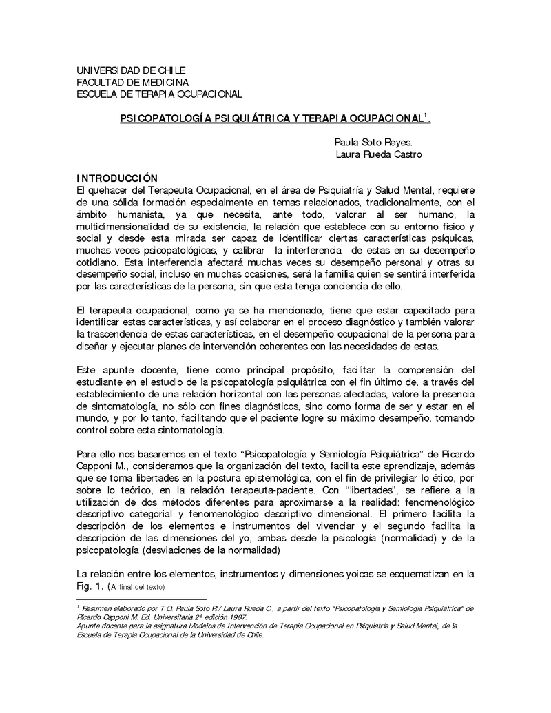| Descripción | ASIGNATURA CURRICULAR TEORICO-PRACTICO QUE COMPRENDE EL ESTUDIO DE LA PSICOPATOLOGÍA CLINICA DE LAS ENFERMEDADES MENTALES. PROPÓSITO: PROPORCIONAR LOS CONCEPTOS PSICOPATOLOGICOS Y PSIQUIATRICOS FUNDAMENTALES NECESARIOS EN T. OCUPACIONAL PARA SU LABOR DE EVALUACIÓN, AYUDA DIAGNOSTICA Y REHABILITACIÓN EN PSIQUIATRIA. |