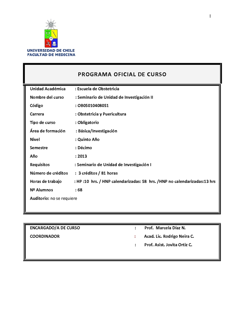 | Objetivos | PROPOSITO FORMATIVO Este curso pretende: Que los estudiantes utilicen herramientas de investigación cuantitativa y/ o cualitativa para la identificación, intervención y evaluación de la situación de salud de la población y así contribuir a elevar la calidad de vida de la mujer, recién nacido, su pareja familia y comunidad. LINEA FORMATIVA A LA QUE CONTRIBUYE Contribuye al logro de las competencias del Dominio Salud Pública, Investigación, Genérico Transversal y a la línea de formación Básica del Perfil de Egreso. |