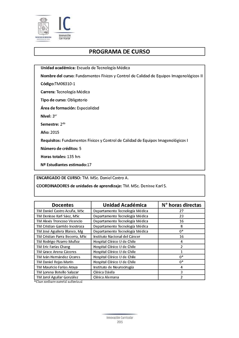 TM06310-1 Fundamentos Físicos y Control de Calidad de Equipos Imageneológicos II 2015, Segundo Semestre