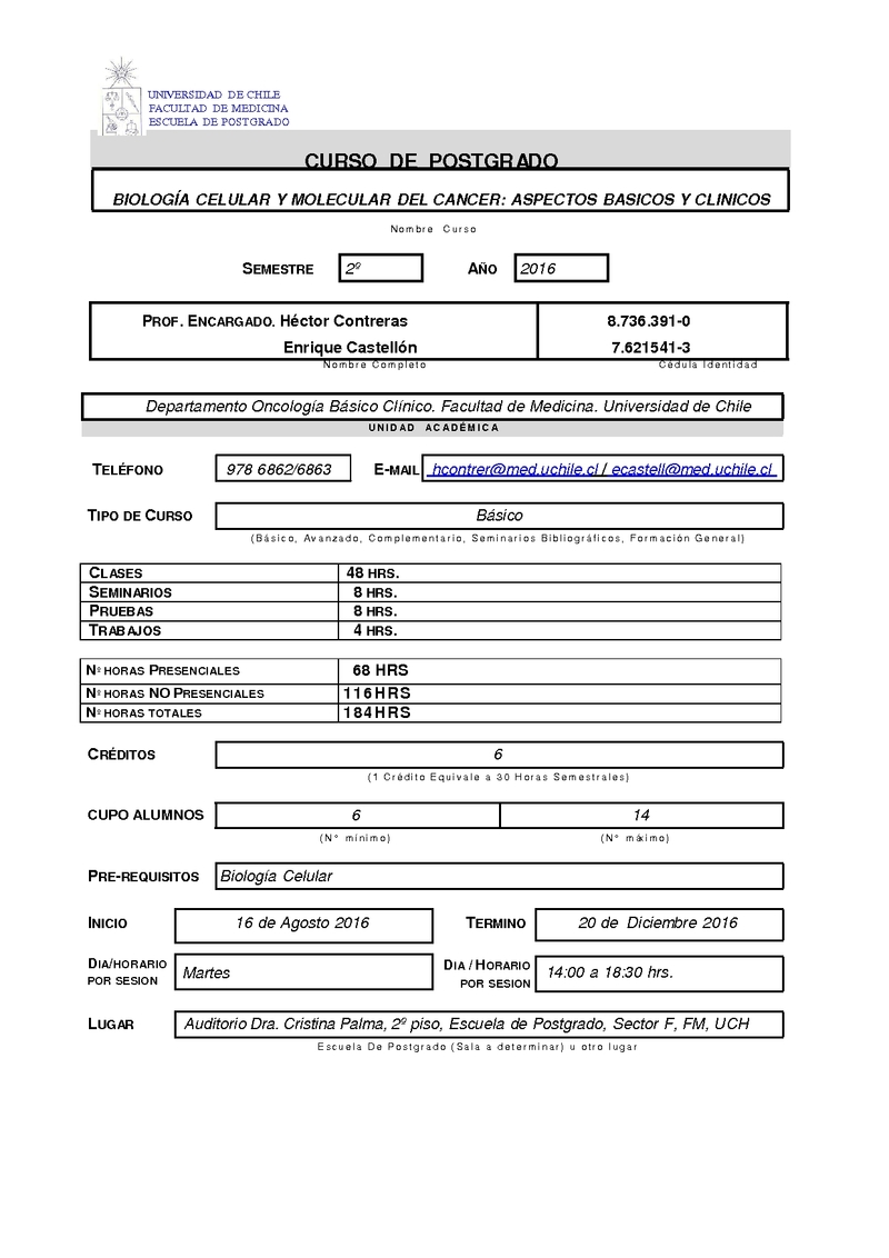 CBBCMCABC-1 Biología Celular y Molecular del Cáncer: Aspectos Básicos y Clínicos 2016, Segundo Semestre