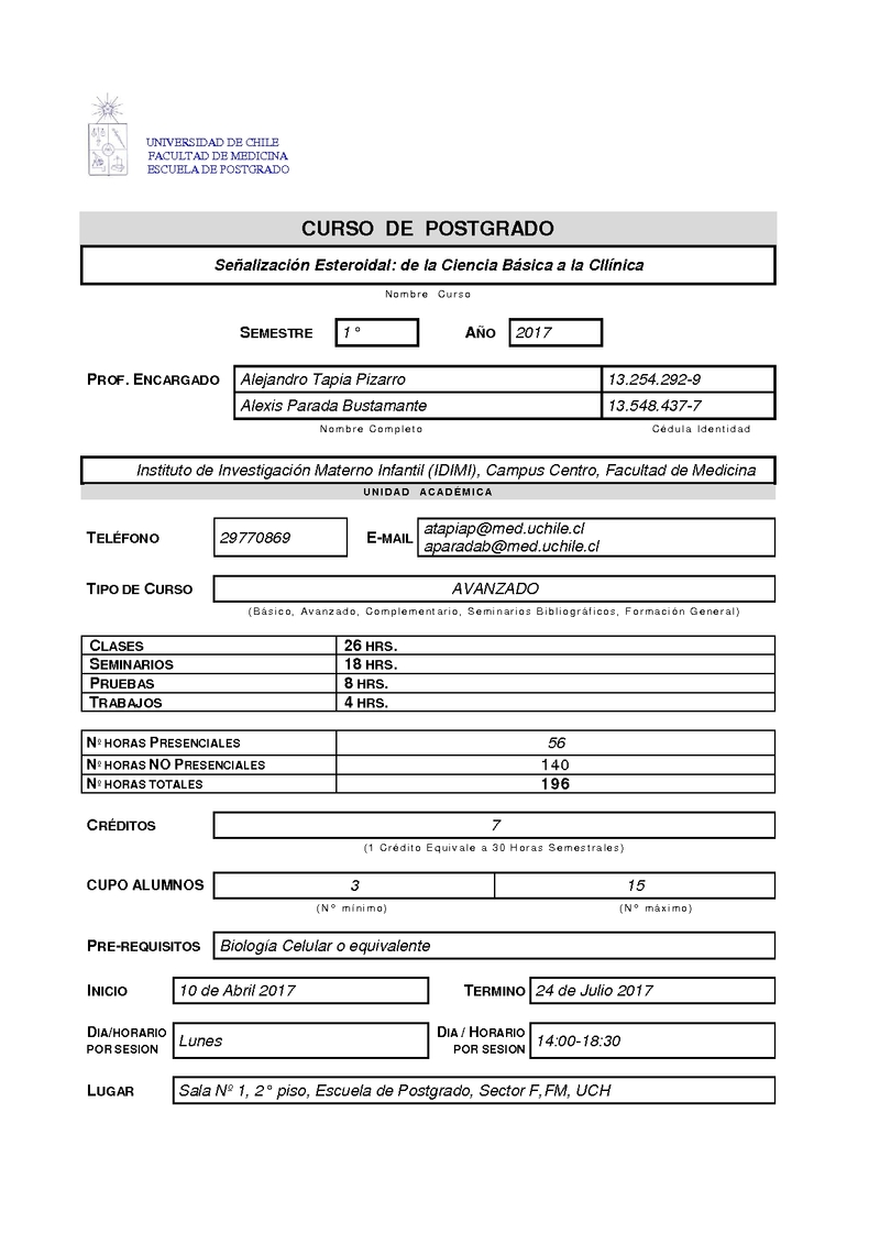 | Metodología | Los contenidos del curso están divididos en dos Unidades Temáticas. La metodología está organizada en Clases Conceptuales, seminarios bibliográficos y la elaboración de un informe de investigación bibliográfica con exposición oral acerca de una patología que involucre la señalización esteroidal. -Clases conceptuales: consistirán en clases expositivas de carácter integrativo y participativo, en las cuales se presentarán los aspectos más relevantes de cada unidad temática a nivel básico con énfasis en los aspectos fisiopatológicos. -Seminarios bibliográficos: Consistirán en la discusión de trabajos publicados en revistas de alto impacto sobre temas atingentes a las clases desarrolladas en cada unidad temática. -Informes de investigación bibliográfica y exposición oral: Esta actividad pretende que el alumno profundice sobre el conocimiento de patologías relacionadas a fallas esteroidales. En esta, cada alumno deberá entregar un informe detallado sobre una patología determinada y deberá realizar una presentación del trabajo realizado a todos sus compañeros. |