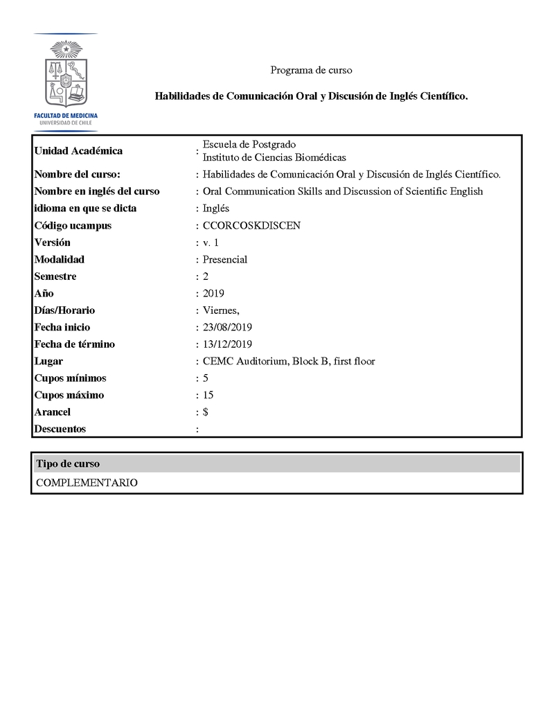 CCORCOSKDISCEN-1 Oral Communication Skills and Discussion of Scientific English 2019, Segundo Semestre