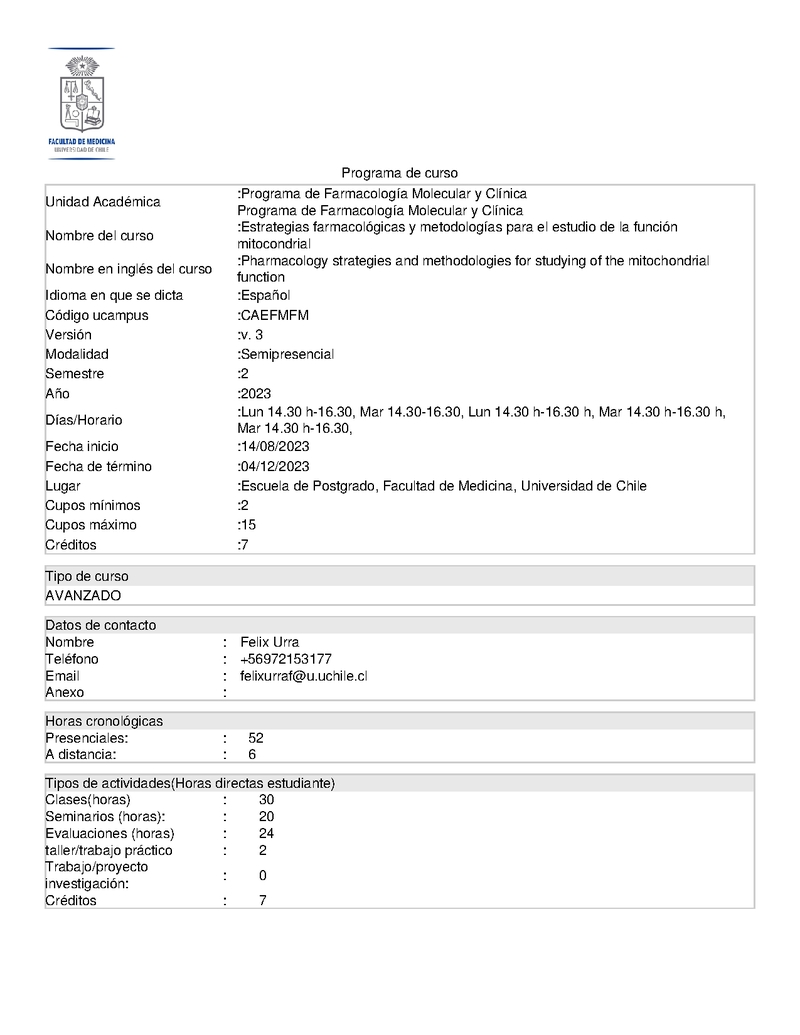 CAEFMEFUMI-1 Estrategias farmacológicas y metodologías para el estudio de la función mitocondrial 2023, Segundo Semestre
