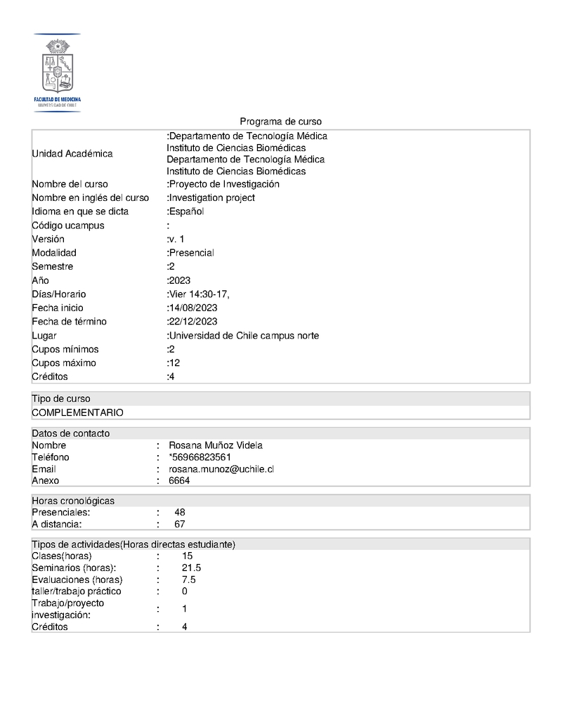 | Descripción | Es un curso cuyo propósito es que los/as estudiantes, guiados por su profesor/a tutor/a, elaboren un proyecto de investigación en el campo de la Microbiología que busque resolver un problema con originalidad y creatividad. Esta propuesta, deberá ser contextualizada en un marco teórico pertinente y actualizado. Propondrán una hipótesis y objetivos que permitan abordar un problema determinado y plantearán una estrategia experimental que les permita cumplir con los objetivos y responder a la hipótesis propuesta. Durante el desarrollo del curso se realizarán clases teóricas que permitan a los/as estudiantes introducirse en el método científico, como también, actividades que permitan hacer un seguimiento de los avances en el diseño y la escritura de sus proyectos. En los casos que lo requieran, se vigilará que avancen con las certificaciones éticas y/o bioéticas que correspondan. Los/as estudiantes aplicarán conocimientos sobre Método Científico, para proponer un proyecto de tesis factible de realizar durante el periodo posterior dedicado a la Tesis o AFE. Contribuye al perfil de egreso entregando herramientas para la aplicación del método científico en la resolución de un problema microbiológico, aplicación de nuevos protocolos y estrategias que contribuyan al diagnóstico y/o tratamiento de enfermedades infecciosas, aportando al desarrollo disciplinar y/o de la salud pública y/o a mejorar el servicio que se entrega a la comunidad país. |