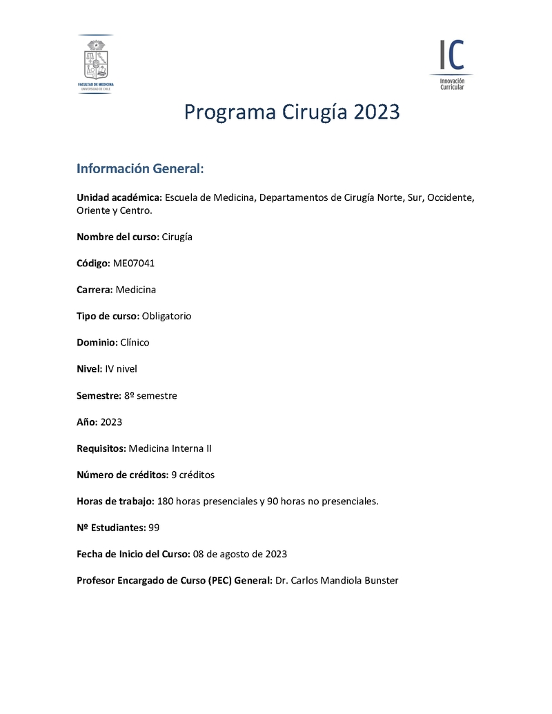 | Descripción | Estimados estudiantes, Junto con darles la más cordial bienvenida, les adjunto el programa del curso de este segundo semestre 2023. Saludos cordiales, Dr. Carlos Mandiola Bunster PEC general Curso Cirugía IV año de Medicina |
