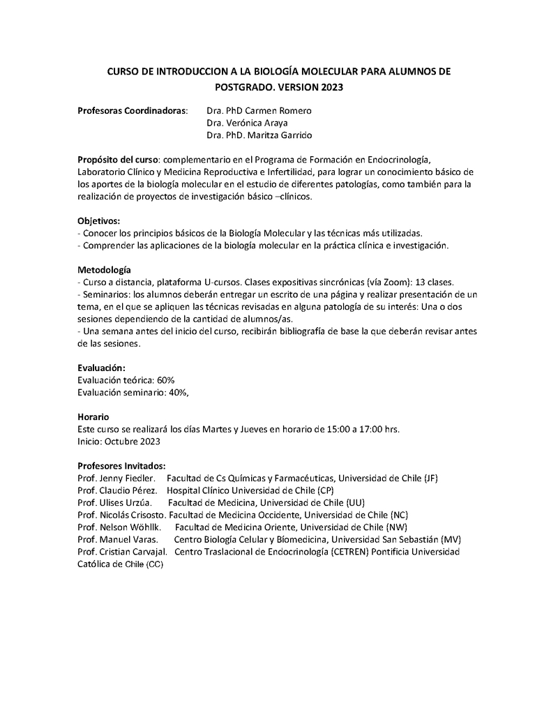 | Descripción | Les damos la bienvenida a la versión 2023 del Curso "Biología Molecular para alumnos de Programas de Postgrado". El objetivo de este curso es entregarles las bases para la comprensión de los estudios clínicos y de investigación que les toque revisar o, que quieran desarrollar dentro de su formación. Esperamos les sea de utilidad en el ejercicio de su especialidad.  |