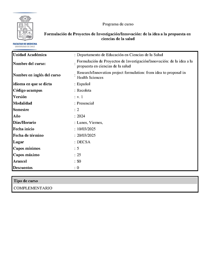 PGAMES063-1 Formulación de Proyectos de Investigación/Innovación: de la idea a la propuesta en ciencias de la salud 2024, Segundo Semestre