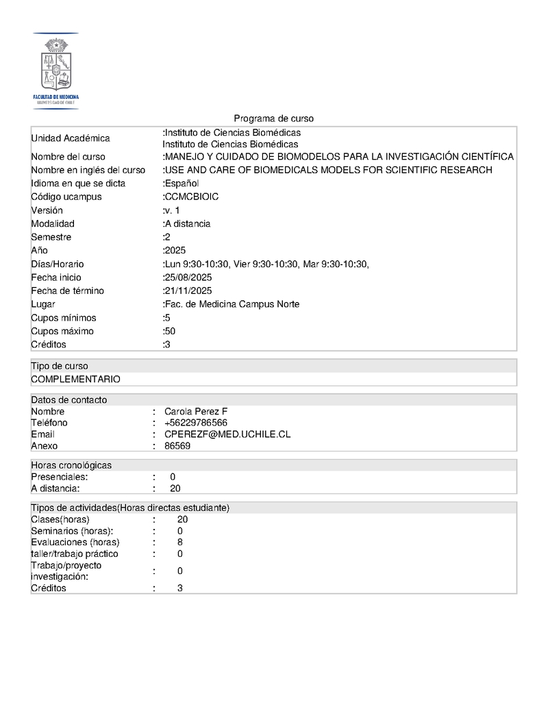 CCMCBIOIC-1 Manejo y Cuidado de Biomodelos para la Investigación Científica 2025, Segundo Semestre