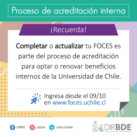 Se informa a los estudiantes que aún no han completado FOCES (Formularios de Caracterización Estudiantil) que los días 15, 16 y 24 de octubre, contaremos monitores ubicados en el hall central de la Facultad (a un costado la cafetería) que responderán tus dudas y consultas respecto a la forma de registrar la información en FOCES y postular a los beneficios internos de la Universidad.