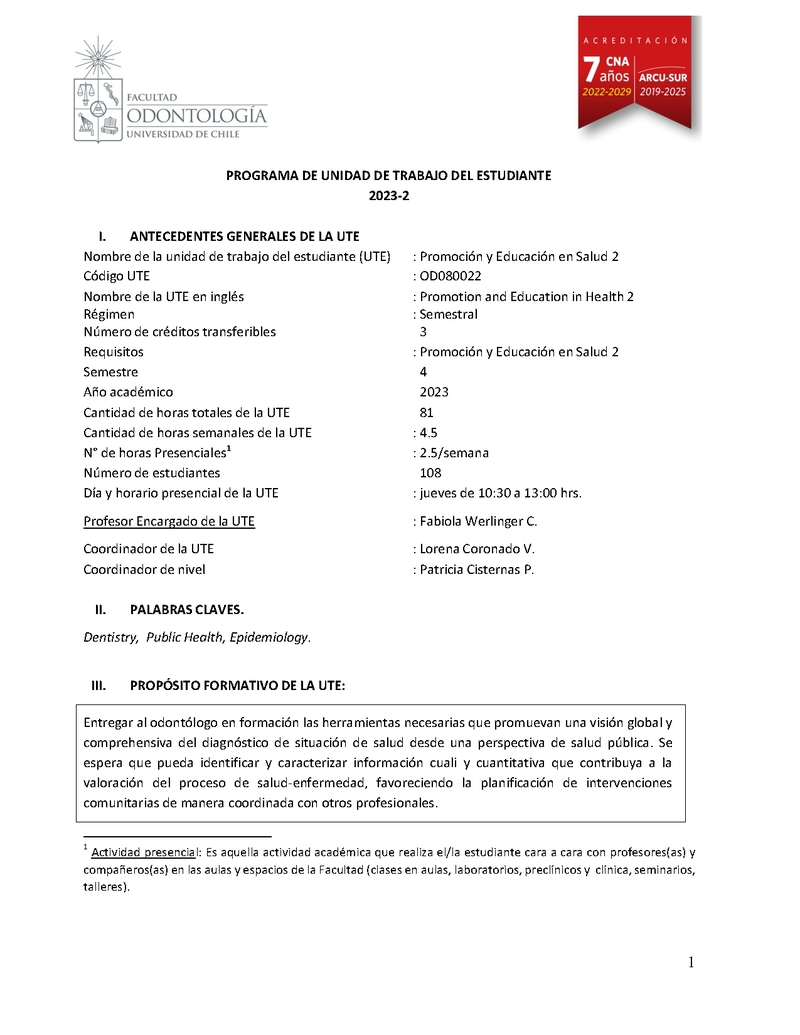 | Descripción | Queridos estudiantes: Es un gusto darles la bienvenida a la UTE de Promoción y Educación en Salud 2 en su versión 2023. Disponemos para ustedes del programa de la asignatura. Nos vemos mañana. Un abrazo a todos, Fabiola Werlinger C. |