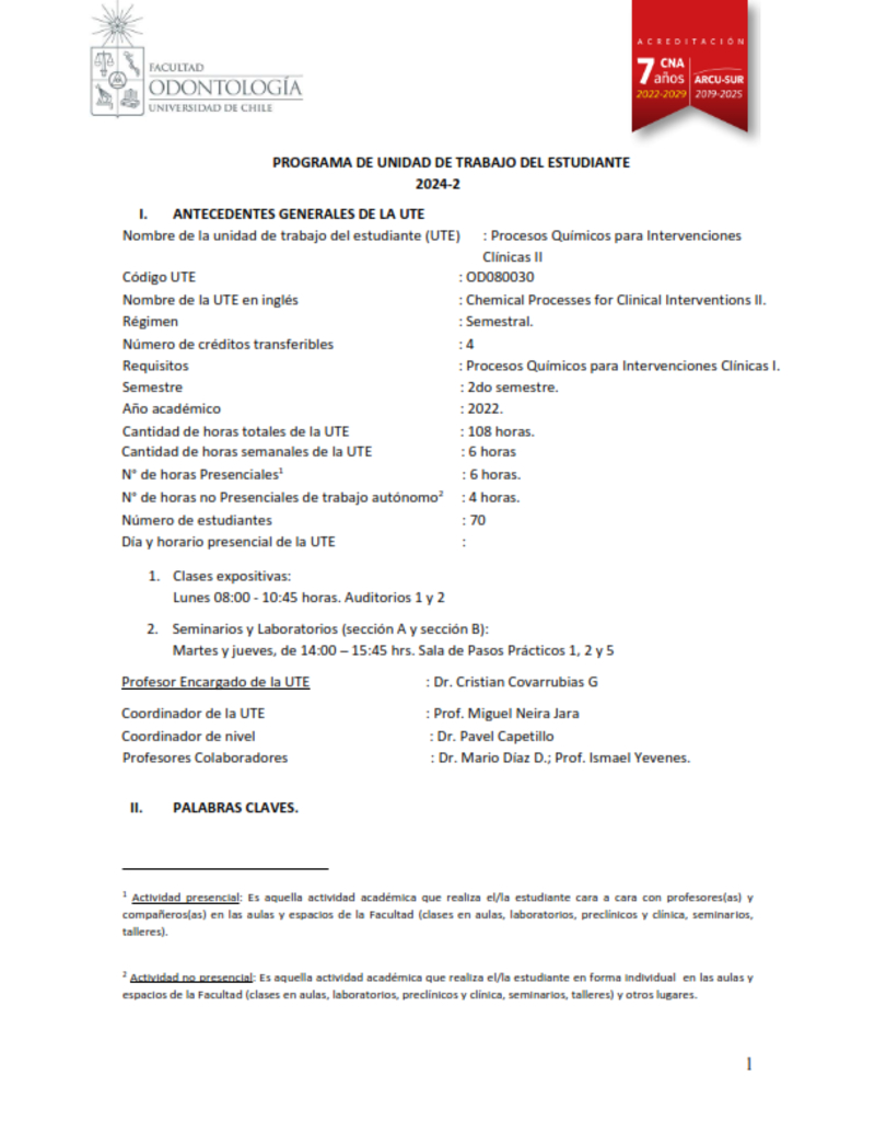Particularmente, la UTE Procesos Químicos para Intervenciones Clínicas II provee competencias relacionadas con la compresión de diferentes procesos químicos que tienen lugar en la cavidad oral que son fundamentales para la futura prevención y promoción de la salud oral, así como para el diagnóstico y tratamiento de enfermedades bucomaxilofaciales en la población.