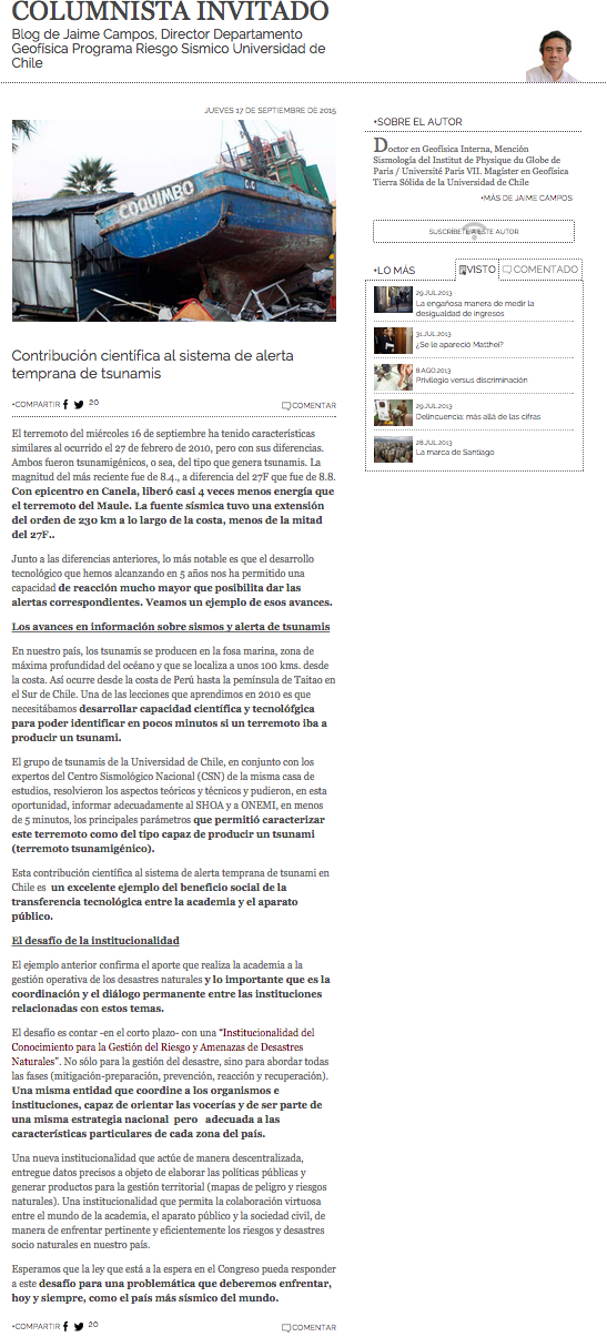 | Descripción | Columna del 17 de septiembre del prof. Jaime Campos sobre la contribución científica de alerta temprana de tsunamis. Para reflexionar sobre uno de los aportes de la academia hacia las instituciones públicas. |