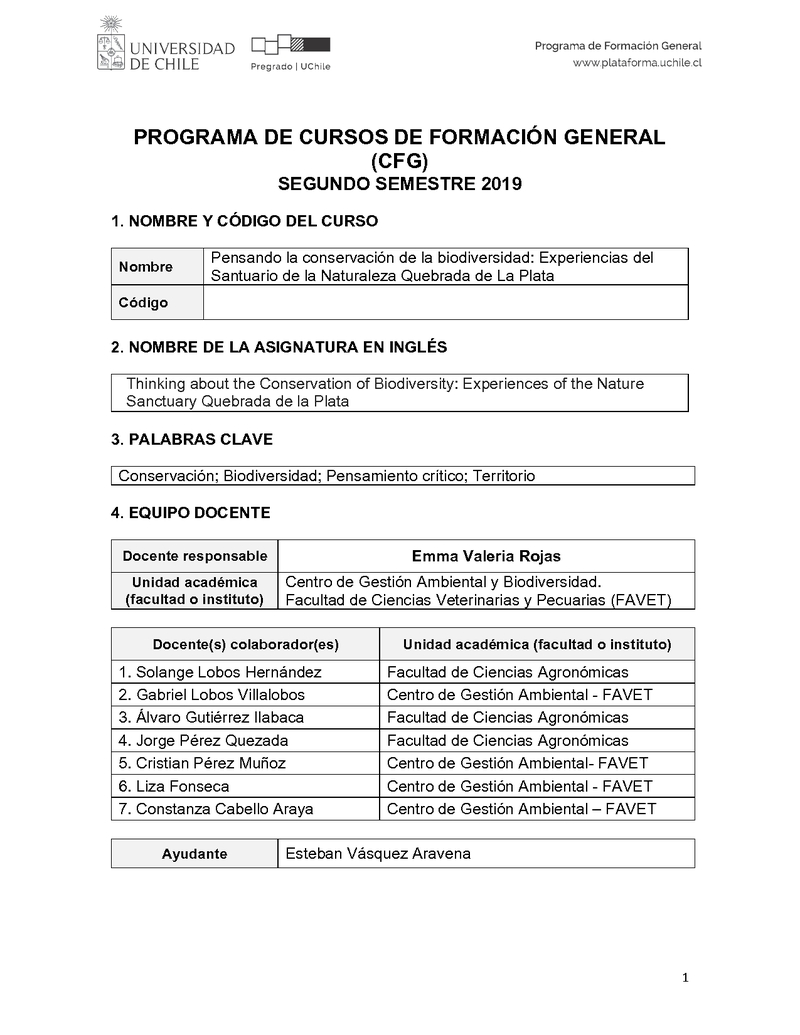 VA-01-0327-5-1 Pensando la conservación de la biodiversidad: experiencias del Santuario de la Naturaleza Quebrada de La Plata 2019, Segundo Semestre