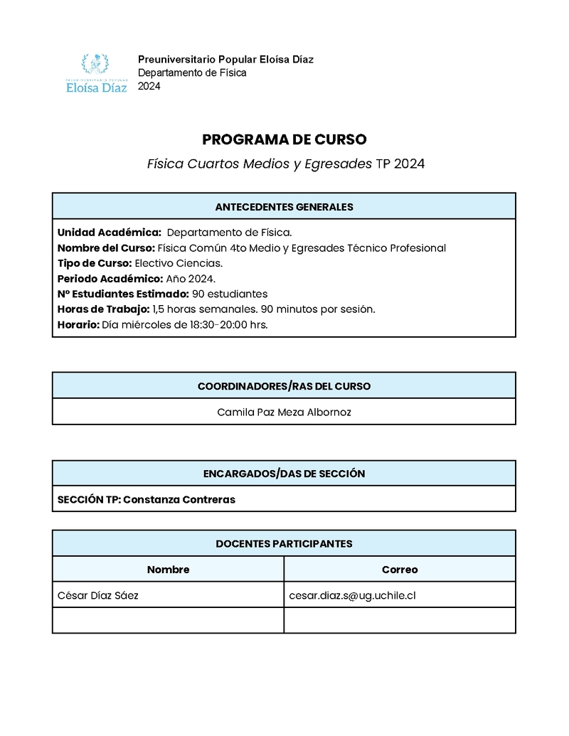 | Descripción | Curso de preparación PAES Ciencias Físicas, dirigido a estudiantes de 4º medio y egresadxs de modalidad Técnico Profesional. Departamento de Física Preuniversitario Popular Eloísa Díaz. Instagram: @preuped.fisica |