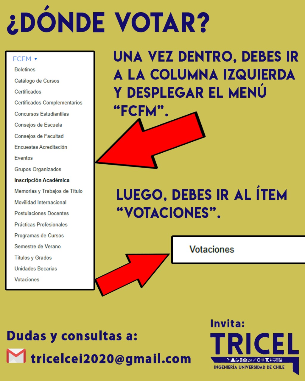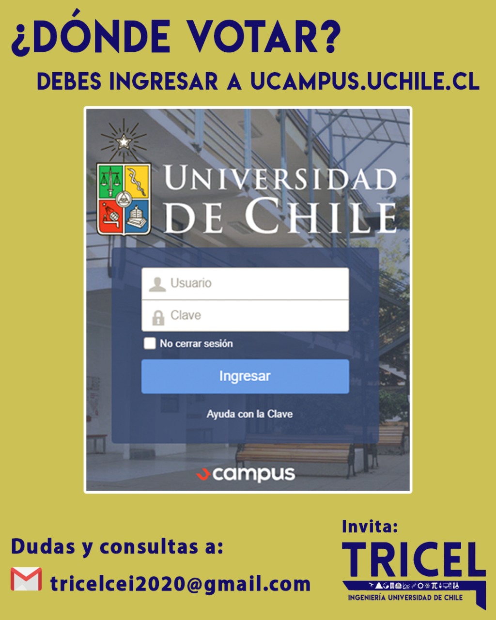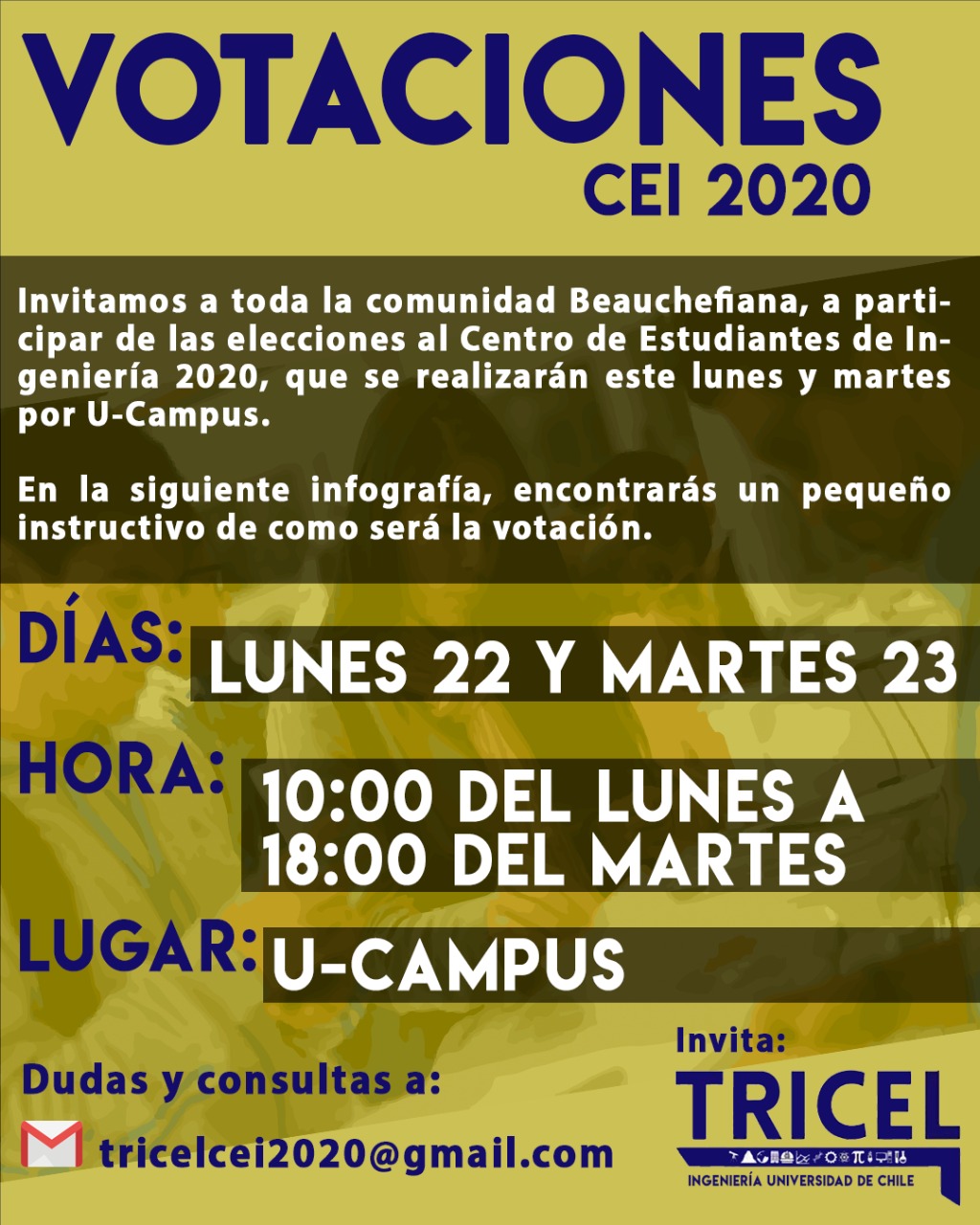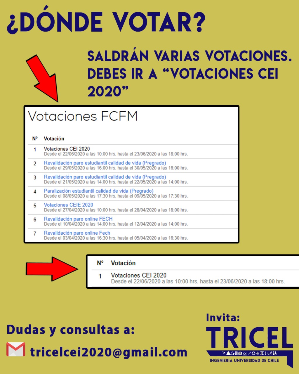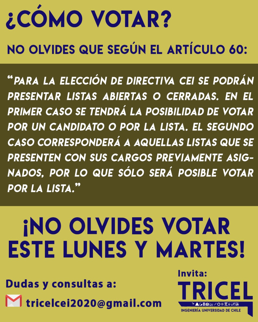 El día de hoy se inició el proceso de votaciones para el Centro de Estudiantes de Ingeniería 2020. Les compartimos material realizado por Tricel 2020 para que estén del proceso. Además pueden encontrar en material docente el comunicado realizado el día de ayer por el mismo organismo 'Comunicado como Tribunal Calificador Electoral CEI 2020'.