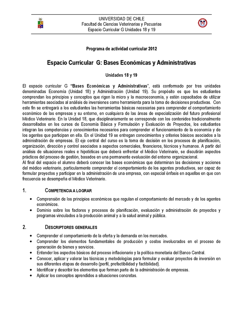 | Objetivos | COMPETENCIAS A LOGRAR • Comprender los principios económicos que regulan el comportamiento del mercado y de los agentes económicos. • Formular y evaluar proyectos de inversión en el ámbito de la producción animal y medicina veterinaria • Aplicar las funciones gerenciales en organizaciones del ámbito de la producción animal, salud animal o salud pública OBJETIVOS DE APRENDIZAJE • Comprender el comportamiento de la oferta y la demanda en los mercados • Comprender los fundamentos económicos de la producción de bienes y servicios • Entender los aspectos básicos del proceso inflacionario y la política monetaria del Banco Central • Conocer, aplicar y valorar las técnicas y metodologías para formular y evaluar proyectos de inversión en sus diferentes etapas de desarrollo (perfil, prefactibilidad y factibilidad) • Identificar y describir los elementos que forman parte de la administración de empresas • Aplicar los conceptos aprendidos a situaciones concretas • Utilizar métodos de apoyo a la toma de decisión • Definir las líneas generales para la administración de una mediana o pequeña empresa • Reconocer los elementos del entorno que afectan a las organizaciones |