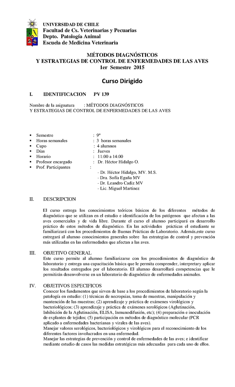 PV139-1 Métodos Diagnósticos y Estrategias de Control de Enfermedades de las Aves 2015, Segundo Semestre