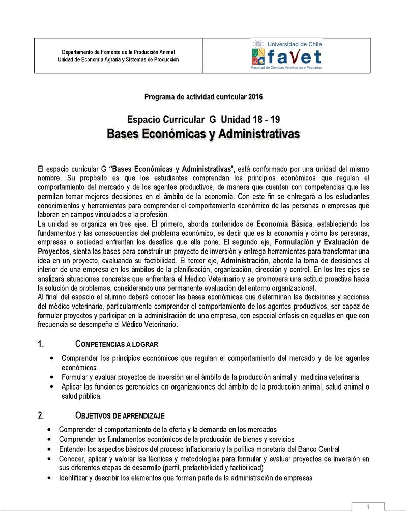 La unidad se organiza en tres ejes. El primero, aborda contenidos de Economía Básica, estableciendo los fundamentos y las consecuencias del problema económico, es decir que es la economía y cómo las personas, empresas o sociedad enfrentan los desafíos que ella pone. El segundo eje, Formulación y Evaluación de Proyectos, sienta las bases para construir un proyecto de inversión y entrega herramientas para transformar una idea en un proyecto, evaluando su factibilidad. El tercer eje, Administración, aborda la toma de decisiones al interior de una empresa en los ámbitos de la planificación, organización, dirección y control. En los tres ejes se analizará situaciones concretas que enfrentará el Médico Veterinario y se promoverá una actitud proactiva hacia la solución de problemas, considerando una permanente evaluación del entorno organizacional.