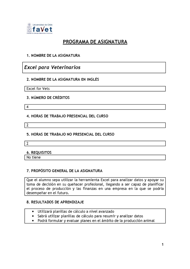 | Metodología | El curso contempla la utilización del programa Excel para resolver problemas que puede enfrentar un médico veterinario durante el ejercicio de su profesión. Para ello en cada sesión se trabajará sobre archivos con datos de muy diversa índole para generar nuevas variables, resúmenes, gráficos, etc. y de esta forma permitir la creación y uso de información. | |
