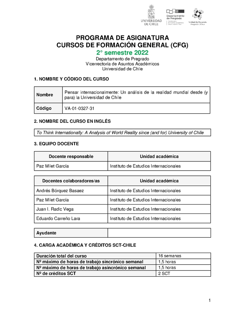 VA-01-0327-31-1 Pensar Internacionalmente: un análisis de la realidad mundial desde (y para) la Universidad de Chile 2022, Segundo Semestre