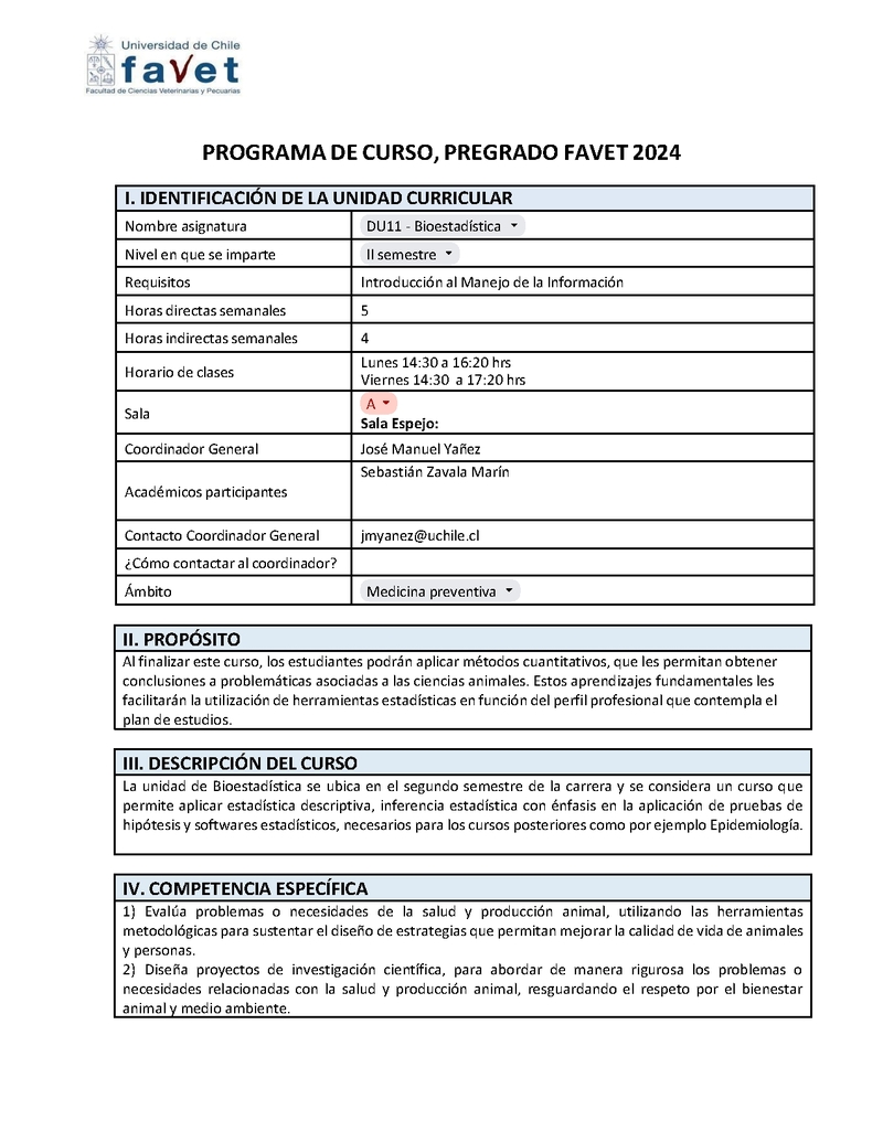 | Descripción | PROGRAMA CURSO BIOESTADISTICA DU11 SEGUNDO SEMESTRE FAVET PREGRADO | |